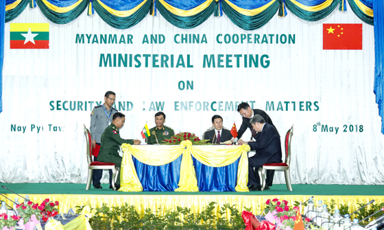 5月8日,國(guó)務(wù)委員、公安部部長(zhǎng)趙克志在內(nèi)比都與緬甸內(nèi)政部部長(zhǎng)覺瑞舉行會(huì)談。圖為會(huì)談后,雙方簽署有關(guān)合作文件。