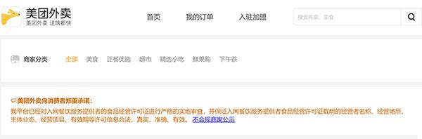 從哪里看違規(guī)餐飲店鋪公示情況?首先,打開(kāi)三個(gè)外賣平臺(tái)的網(wǎng)頁(yè)版并登陸,選擇“北京地區(qū)”后,可以看到網(wǎng)頁(yè)最上端明顯位置發(fā)布了這樣的承諾:“我平臺(tái)已經(jīng)對(duì)入網(wǎng)餐飲服務(wù)提供者的食品經(jīng)營(yíng)許可證進(jìn)行嚴(yán)格的實(shí)地審查,并保證入網(wǎng)餐飲服務(wù)提供者食品經(jīng)營(yíng)許可證載明的經(jīng)營(yíng)者名稱、經(jīng)營(yíng)場(chǎng)所、主體業(yè)態(tài)、經(jīng)營(yíng)項(xiàng)目、有效期等許可信息合法、真實(shí)、準(zhǔn)確、有效。”