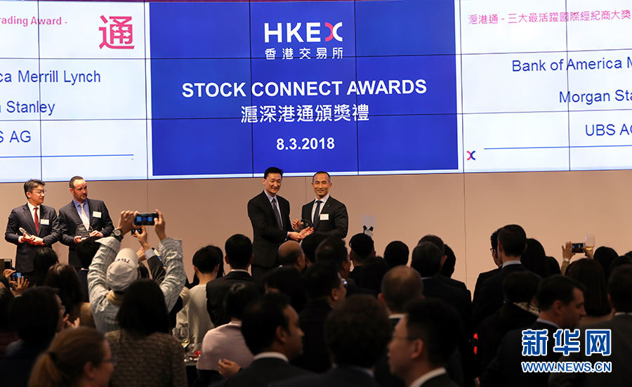 香港交易所舉辦2017年度“滬深港通”頒獎禮,表揚(yáng)主要經(jīng)紀(jì)商于2017年參與“滬深港通”互聯(lián)互通股票交易機(jī)制所取得的成績(3月8日攝)。新華社記者 李鵬 攝