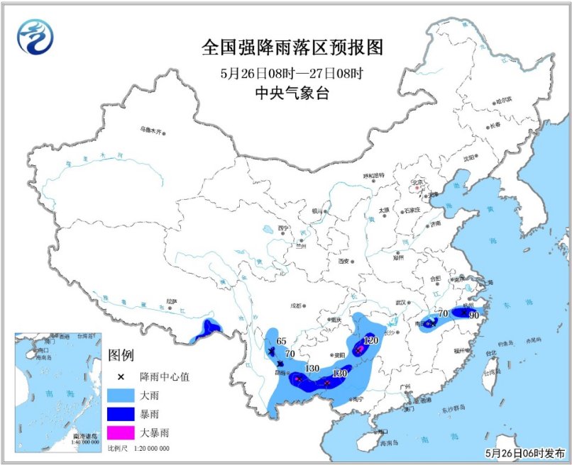 中央氣象臺(tái)預(yù)計(jì),26日8時(shí)至27日8時(shí),浙江中部、江西北部、湖南西部、貴州東部和南部、廣西中西部、云南東部和南部、四川南部等地的部分地區(qū)有大到暴雨,其中,湖南西南部、貴州東部、廣西西北部、云南東部局地有大暴雨(100~130毫米);上述部分地區(qū)并伴有短時(shí)強(qiáng)降水、雷暴大風(fēng)等強(qiáng)對(duì)流天氣,最大小時(shí)降水量40~60毫米。中央氣象臺(tái)5月26日6時(shí)繼續(xù)發(fā)布暴雨黃色預(yù)警。