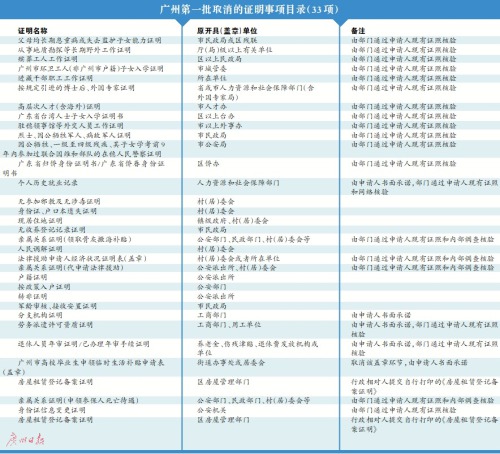 據(jù)悉,廣州自去年10月起已啟動“減證便民”專項工作,由市編辦牽頭,會同市法制辦、市政務(wù)辦對市政府各部門的證明事項進行梳理審核。經(jīng)研究,市政府第一批取消7個部門共33項證明事項,其中市教育局13項、市人力資源社會保障局10項、市公安局4項、市司法局3項、市民政局1項、市交委1項、市食品藥品監(jiān)管局1項。