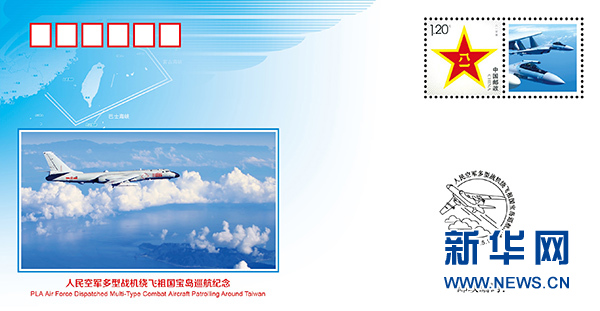 這次發(fā)行的一套兩枚中英文版紀(jì)念封,是中國(guó)集郵總公司根據(jù)新華社公開播發(fā)的有關(guān)報(bào)道和新聞?wù)掌O(shè)計(jì)制作,記錄了空軍轟-6K等多型戰(zhàn)機(jī)多次繞飛祖國(guó)寶島巡航的航跡。