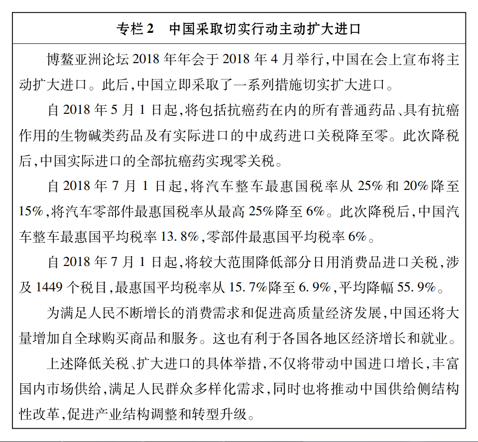 站在新時代的歷史起點上,中國開放的大門不會關(guān)閉,只會越開越大。中國過去40年的經(jīng)濟(jì)發(fā)展是在開放條件下取得的,未來中國經(jīng)濟(jì)實現(xiàn)高質(zhì)量發(fā)展也將在更加開放條件下進(jìn)行。中國將繼續(xù)堅持對外開放基本國策,以更加積極的姿態(tài)融入經(jīng)濟(jì)全球化進(jìn)程,實行高水平的貿(mào)易和投資自由化便利化政策,與各國構(gòu)建利益高度融合、彼此相互依存的命運(yùn)共同體。