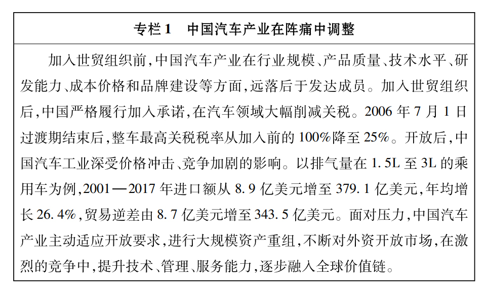 中國在加入世貿(mào)組織時作出廣泛而深入的開放承諾,國內(nèi)企業(yè)直接面對國際競爭,多數(shù)產(chǎn)業(yè)面臨較大困難。中國企業(yè)主動應(yīng)對挑戰(zhàn),大力推進(jìn)產(chǎn)業(yè)結(jié)構(gòu)調(diào)整,積極參與全球價值鏈,國際競爭力明顯提升。
