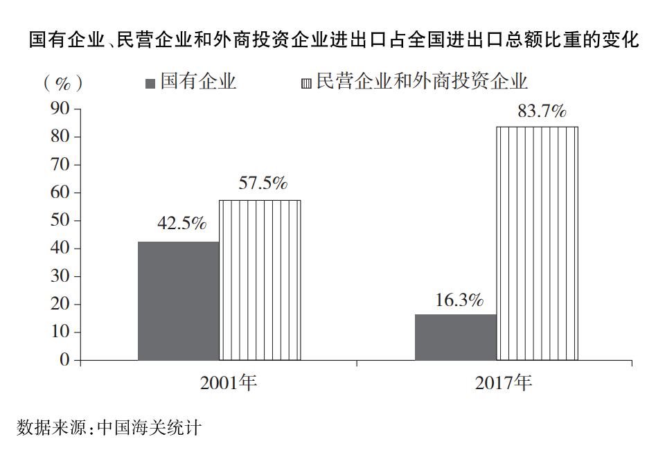 全面放開外貿(mào)經(jīng)營權(quán)。促進(jìn)經(jīng)營主體多元化,激發(fā)各類企業(yè)開展貿(mào)易的積極性。自2004年7月起,中國對企業(yè)的外貿(mào)經(jīng)營權(quán)由審批制改為備案登記制,極大地釋放了民營企業(yè)的外貿(mào)活力,民營企業(yè)進(jìn)出口發(fā)展迅速,份額持續(xù)擴(kuò)大,成為對外貿(mào)易的重要經(jīng)營主體。民營企業(yè)和外商投資企業(yè)進(jìn)出口占全國進(jìn)出口總額的比重由2001年的57.5%上升到2017年的83.7%。2017年,作為第一大出口經(jīng)營主體的民營企業(yè)出口占比達(dá)46.6%。