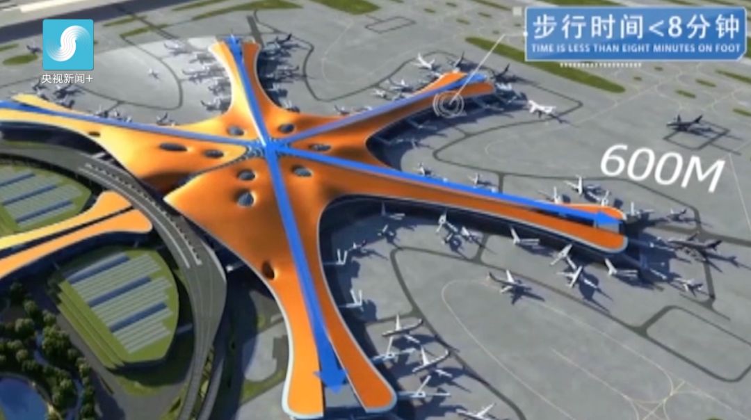 這樣的設(shè)計不僅可以設(shè)置更多的進機位,而且也使航站樓中心到最遠端登機口步行距離不超過600米,步行時間不到8分鐘。