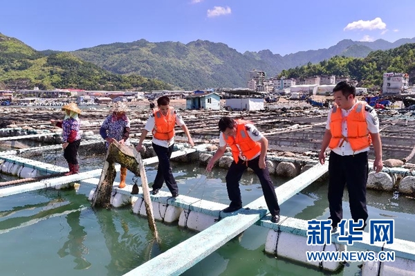 7月10日,寧德市蕉城區(qū)海洋與漁業(yè)執(zhí)法大隊(duì)工作人員在三都澳鎮(zhèn)城澳村幫助漁民加固漁排。新華社記者林善傳攝