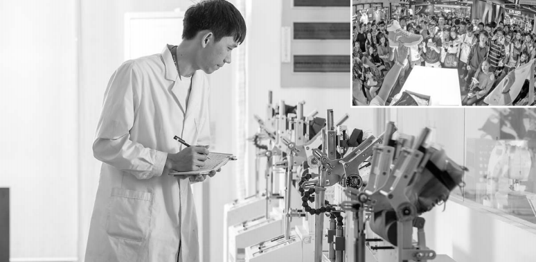 大圖:安踏投資建設(shè)的國家級(jí)運(yùn)動(dòng)科學(xué)實(shí)驗(yàn)室。小圖:安踏旗下首款全球限量籃球鞋——— KT3 Rocco 引發(fā)排隊(duì)搶購的場面。圖片由受訪者提供