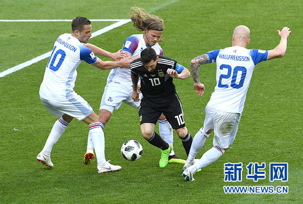 俄羅斯的世界杯之夏,昔日的“平民”球隊群雄并起,他們敢于跟傳統(tǒng)豪強叫板,把曾經(jīng)的世界杯冠軍得主接連挑落馬下,讓本屆世界杯成為“平民”球隊展示自己風采的舞臺。圖為6月16日,在俄羅斯世界杯足球賽D組阿根廷隊對陣冰島隊的比賽中,阿根廷隊球員梅西(右二)受到冰島隊三名球員包夾。最終,冰島隊以1比1逼平阿根廷隊。新華社記者王毓國攝