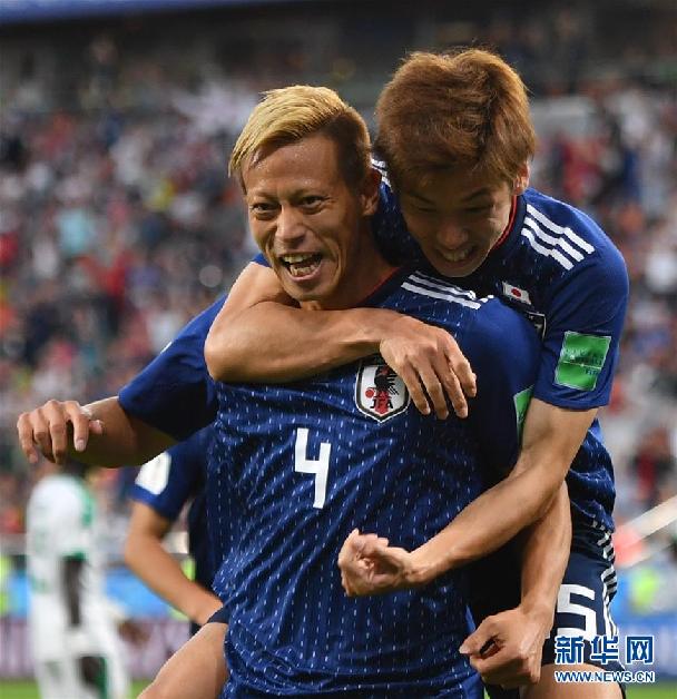 圖為2018年6月24日,在葉卡捷琳堡進行的2018俄羅斯世界杯足球賽H組小組賽日本隊對陣塞內(nèi)加爾隊的比賽中,日本隊球員本田圭佑(左)在進球后慶祝。最終,日本隊以2比2戰(zhàn)平塞內(nèi)加爾隊。新華社記者劉大偉 攝