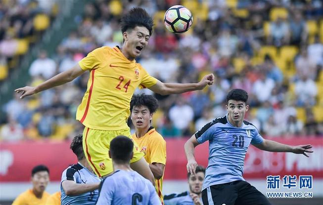 圖為2018年5月27日,在四川成都舉行的2018“熊貓杯”國際青年足球錦標賽中國U19國家青年隊對陣烏拉圭U19國家青年隊的比賽中,中國隊球員蔣圣龍(上)在比賽中爭頂。最終,中國U19國家青年隊以3比1戰(zhàn)勝烏拉圭U19國家青年隊。新華社記者薛玉斌 攝