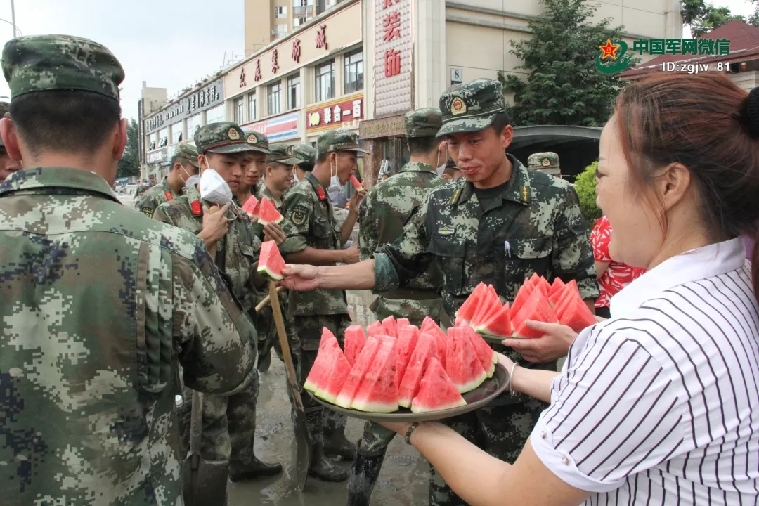 群眾自發(fā)為救災(zāi)官兵送西瓜。劉學(xué)功 攝