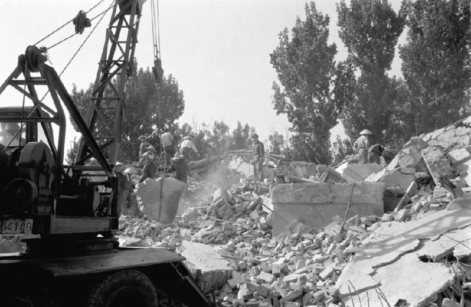 1976年7月28日,強烈地震中,唐山礦業(yè)學(xué)院宿舍樓被震毀。新華社記者 官天一 攝