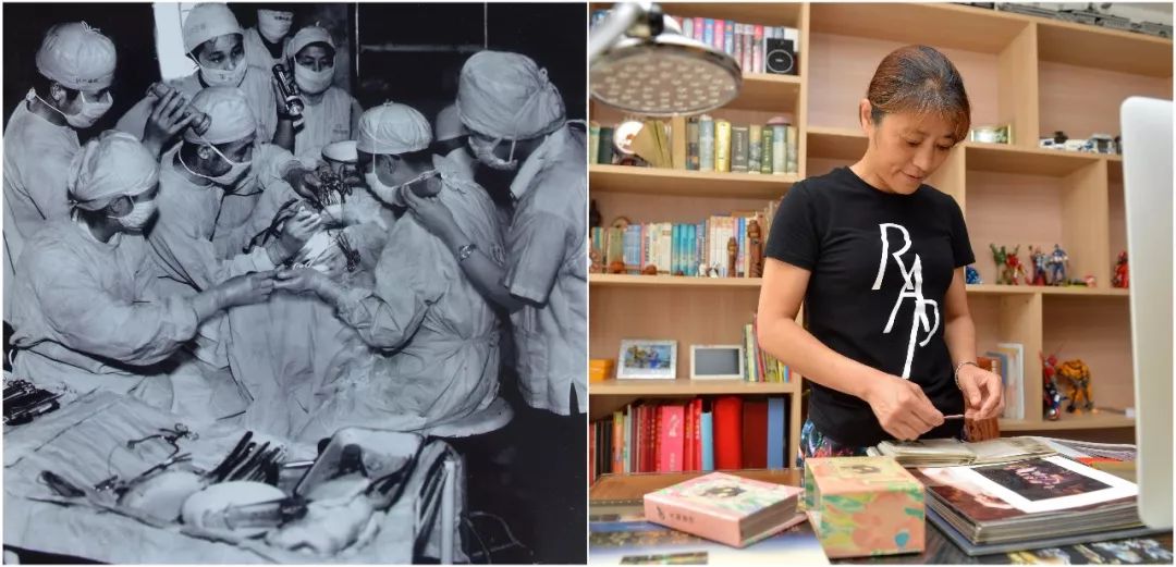 拼版照片:左圖為唐山大地震發(fā)生后,上海醫(yī)療隊在給傷員做手術(shù)(資料照片);右圖為2016年7月24日,“地震嬰兒”孫滬在家中整理老照片(新華社記者 牟宇 攝)。
