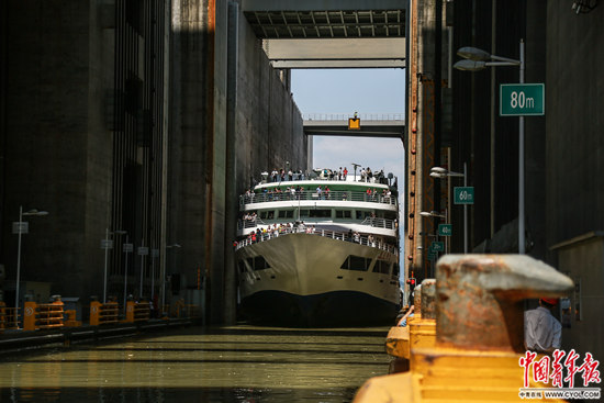 7月31日,湖北省宜昌市,船只準(zhǔn)備進(jìn)入三峽大壩升船機(jī),進(jìn)入廂體后這艘100多米長(zhǎng)的客船將乘升船機(jī)下降80多米,“翻越”大壩。三峽升船機(jī)是世界上規(guī)模最大的升船機(jī),也是三峽工程的收官之作。中國(guó)青年報(bào)·中青在線(xiàn)記者 趙迪/攝