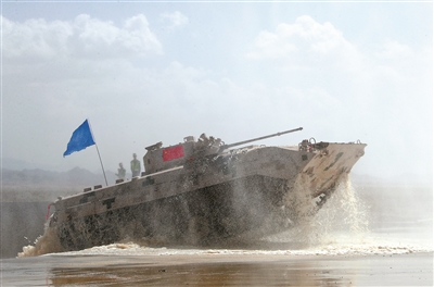 “蘇沃洛夫突擊”步戰(zhàn)車(chē)組項(xiàng)目比賽中,中國(guó)參賽隊(duì)?wèi)?zhàn)車(chē)穿越涉水場(chǎng)。袁 凱攝