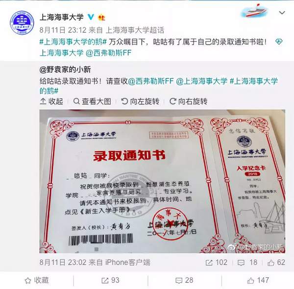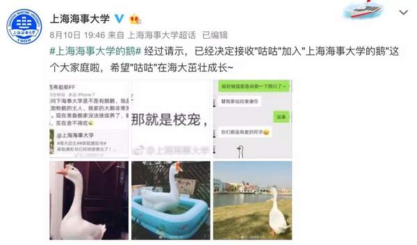 經(jīng)過請示,上海海事大學(xué)回復(fù)稱,決定接收這只名叫“咕咕”的鵝加入“上海海事大學(xué)的鵝”這個大家庭。