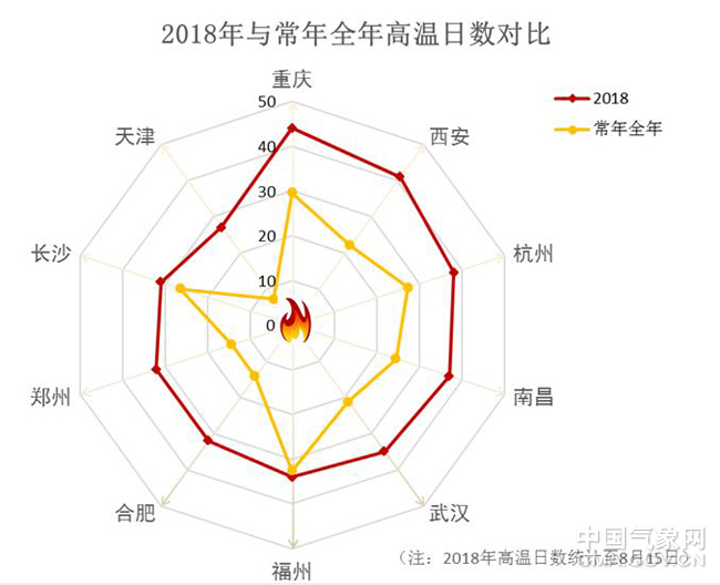 我們統(tǒng)計了2018年省會級城市的高溫日數(shù),截至8月15日,省會級城市高溫日數(shù)排在第一的是重慶(44天),其次為西安(41天)、杭州(38天)、南昌(37天)和武漢(35天)。多數(shù)城市的高溫日數(shù)比常年全年高溫日數(shù)偏多10天以上,其中西安和天津比常年全年分別偏多19天和19.9天。