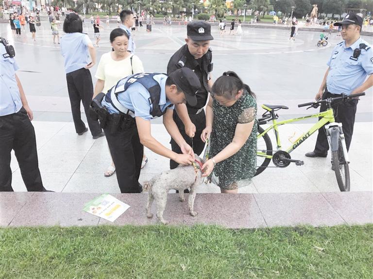 傍晚時,蒲江縣世紀廣場很是熱鬧,是市民們飯后休閑娛樂散步的集中地,其中也不乏帶著愛犬出來散步的市民。蒲江縣公安局巡防大隊民警走上街頭,現(xiàn)場對沒有為愛犬套上牽引繩的市民進行勸導(dǎo)并免費發(fā)放牽引繩。面對民警的勸導(dǎo)和發(fā)放牽引繩的執(zhí)法方式,市民們紛紛點贊,“人性化的執(zhí)法方式在宣傳文明養(yǎng)犬重要性的同時,也讓市民們更易接受,從實際出發(fā)緩和了矛盾,值得推廣!”