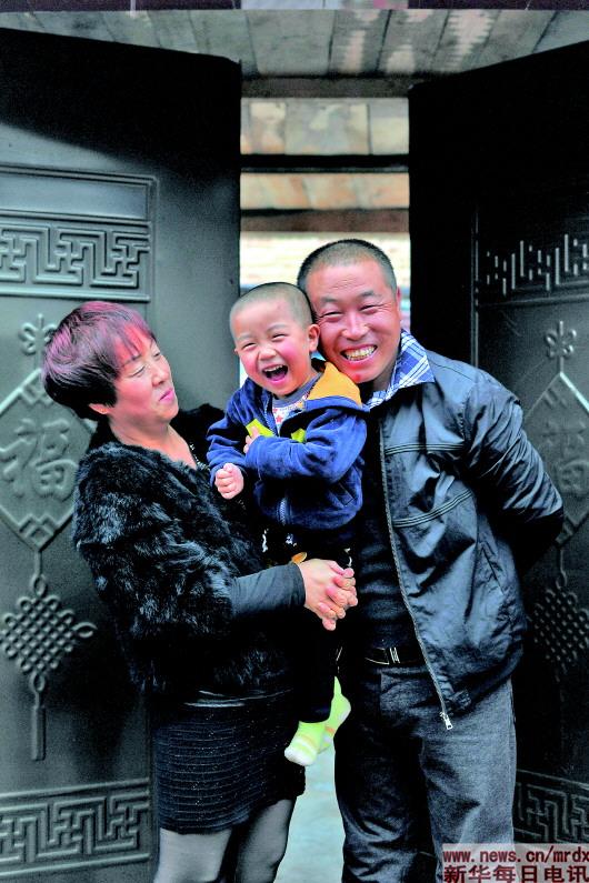 馬愛威(右)和妻子宋瑞風(fēng)及兒子在家門口合影(2017年10月17日攝)。