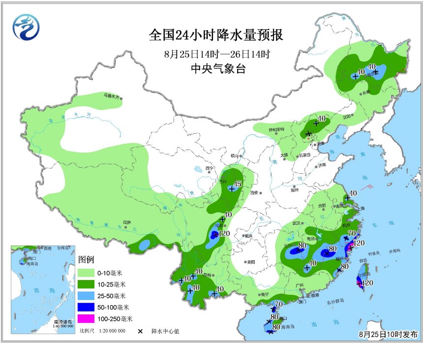 孫軍:由于熱帶低壓登陸后向西移動緩慢,預計25日至27日,受熱帶低壓和季風共同影響,江南和華南將有持續(xù)性降雨天氣,部分地區(qū)有大到暴雨,局地有大暴雨。浙江東南部、福建西部和南部、江西中南部、湖南中南部、廣西東北部、海南島、臺灣島等地的部分地區(qū)累計降雨量有100毫米至200毫米,局地達250毫米至400毫米。上述部分地區(qū)將有短時強降雨、雷暴大風等強對流天氣。28日至30日,江南、華南仍將有大到暴雨,局地有大暴雨。