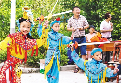 江蘇省海安市經(jīng)濟技術開發(fā)區(qū)戲曲小票友在社區(qū)為居民表演京劇,豐富假日生活。 李曉亮攝