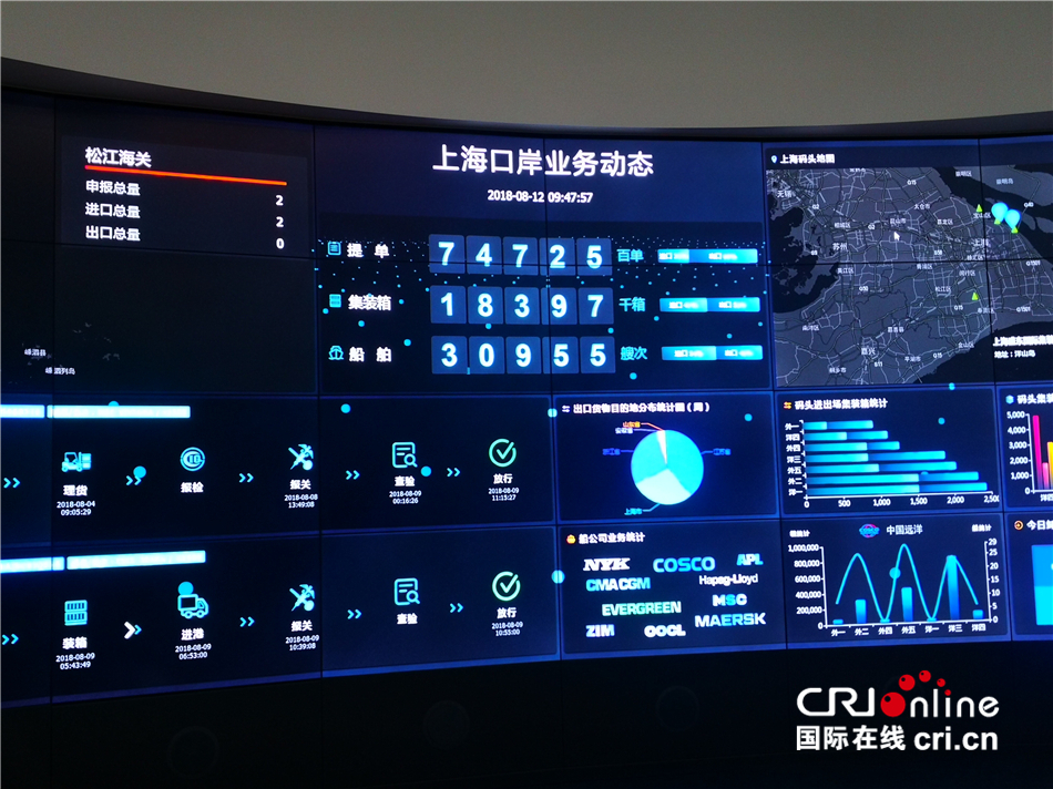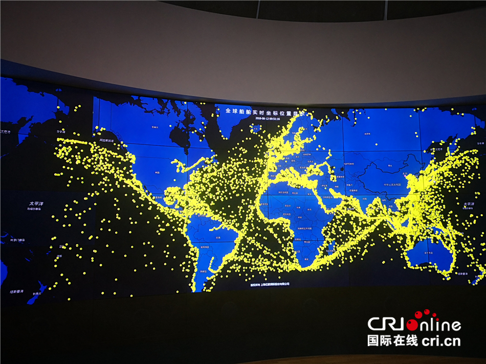 在上海國際貿(mào)易單一窗口運營方、上海億通公司的電子大屏上,密密麻麻的黃色光點顯示著全球船舶的實時坐標(biāo)位置、上??诎稑I(yè)務(wù)動態(tài)等關(guān)鍵信息。