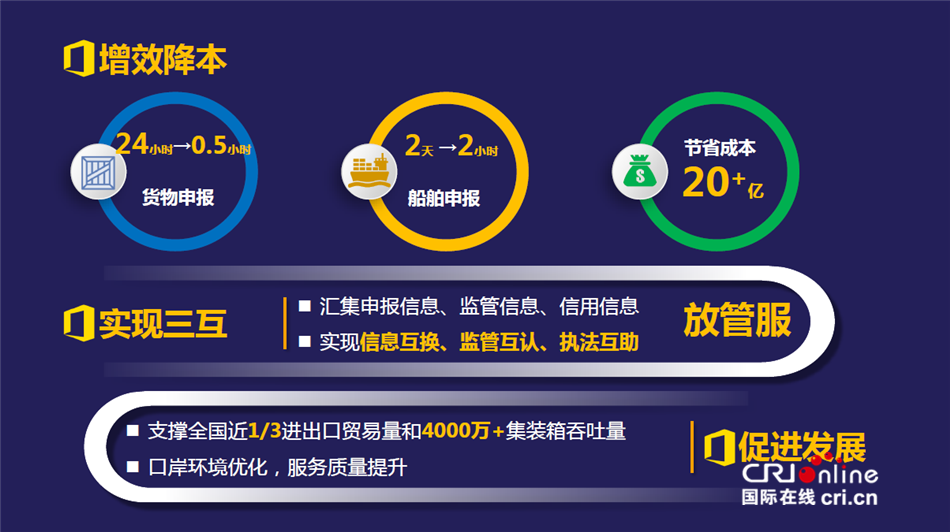 國際貿(mào)易單一窗口的運營,為貿(mào)易船舶進(jìn)出上海港大大節(jié)約了時間和成本。辦通關(guān)手續(xù)實現(xiàn)了從“人跑路”向“信息跑路”的轉(zhuǎn)變,提交的資料由四套系統(tǒng)1113項數(shù)據(jù)簡化為一套系統(tǒng)388個數(shù)據(jù),船舶進(jìn)出港環(huán)節(jié)全流程從原來的2天縮短至2小時,貨物進(jìn)出口申報環(huán)節(jié)全流程從24小時縮短至半個小時。