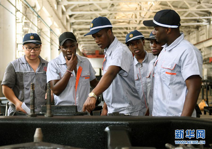 2018年7月24日,來自肯尼亞的留學(xué)生在中國鐵路濟南局集團有限公司濟南車輛段車間聽中國工程師(左一)講解火車底盤構(gòu)造。? 新華社記者 朱崢 攝