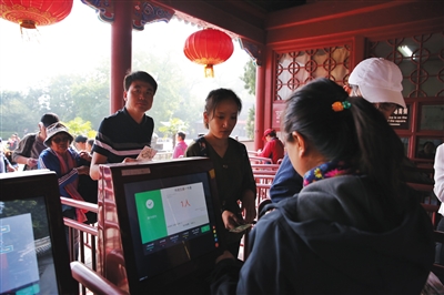 9月28日,香山公園,游客驗(yàn)票入園。今年國慶假期,香山公園每日最大游客承載量為10.1萬人。新京報(bào)記者 侯少卿 攝