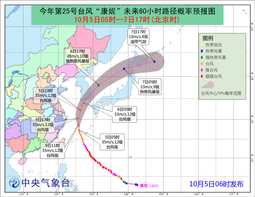 受“康妮”和冷空氣的共同影響,我國東部海域?qū)⒂休^大風(fēng)雨,其中5日08時(shí)到6日08時(shí),黃海南部、東海、臺(tái)灣東北洋面、浙江東部及沿海、上海沿海、江蘇沿海、杭州灣、長江口區(qū)將有7-10級(jí)大風(fēng),其中東海大部、黃海東南部的風(fēng)力可達(dá)11級(jí),“康妮”中心經(jīng)過的東海東北部部分海域風(fēng)力可達(dá)12級(jí),陣風(fēng)13-14級(jí),浙江東北部、上海東部局地有中到大雨。為此,中央氣象臺(tái)10月5日06時(shí)繼續(xù)發(fā)布臺(tái)風(fēng)藍(lán)色預(yù)警。