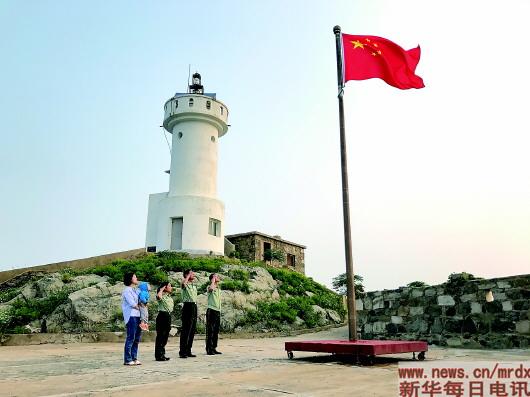 2017年9月12日,王志國(guó)(右一)一家與父母在開(kāi)山島上向國(guó)旗敬禮。新華社發(fā)(謝明明攝)