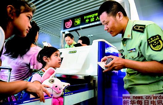 2018年8月7日,王志國(guó)(右)在南京祿口國(guó)際機(jī)場(chǎng)驗(yàn)證臺(tái)外核實(shí)旅客證件。
