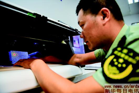 2018年8月7日,在位于南京祿口國(guó)際機(jī)場(chǎng)內(nèi)的南京邊防檢查站證件研究中心,王志國(guó)利用文檢設(shè)備進(jìn)行證件研究。