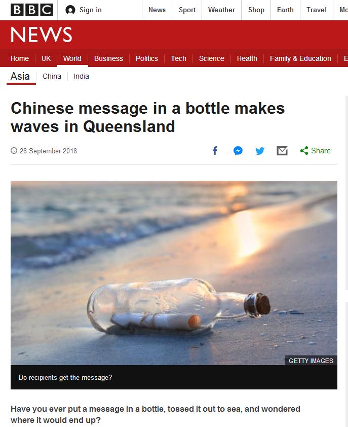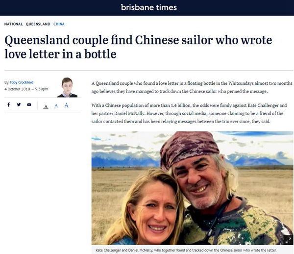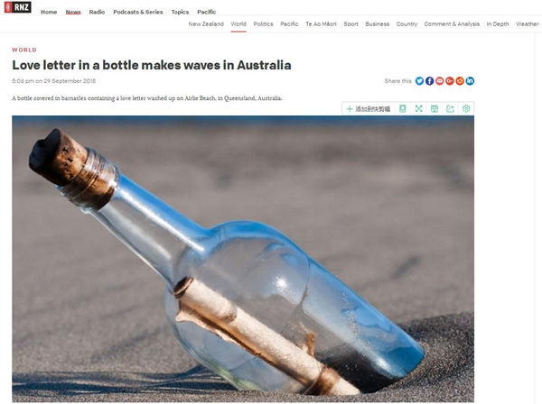 9月29日,新西蘭廣播電臺(tái)(RNZ)轉(zhuǎn)載了英國(guó)廣播公司的這篇報(bào)道,稱中國(guó)海員的這封情書(shū)已經(jīng)在澳大利亞引起轟動(dòng)。