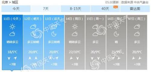 未來幾天北京仍在回暖當(dāng)中,明后天都是多云轉(zhuǎn)晴的天氣,最高氣溫20℃,最低氣溫8℃。到了周日,最高氣溫將回升至22℃,最低氣溫也回到10℃上下。