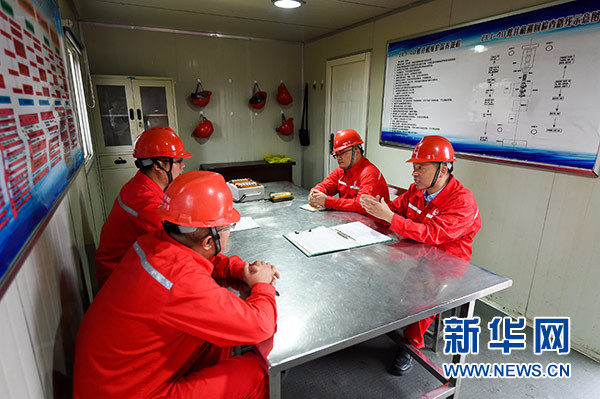 田明(右一)與團隊工作人員在江蘇真武油田井場研究設(shè)備作業(yè)運轉(zhuǎn)情況(10月9日攝)。新華社記者 李博 攝