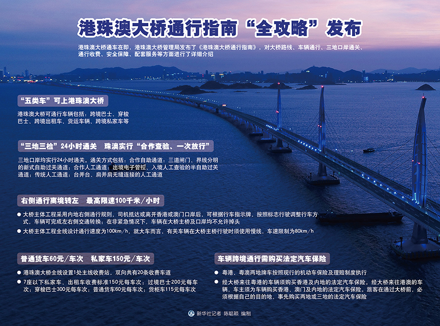 新華社廣州10月21日電(記者 周強(qiáng))港珠澳大橋通車在即,港珠澳大橋管理局發(fā)布了《港珠澳大橋通行指南》,對大橋路線、車輛通行、三地口岸通關(guān)、通行收費、安全保障、配套服務(wù)等方面進(jìn)行了詳細(xì)介紹。