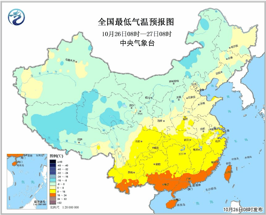 圖為全國最低氣溫預(yù)報圖(26日08時-29日08時)
