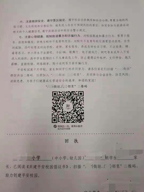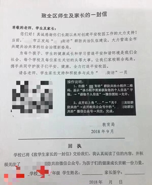 前不久,廣東某地發(fā)起“街坊群防共治隊伍建設(shè)”,并開設(shè)了微信公眾號。當(dāng)?shù)亟逃忠浴吨氯珔^(qū)師生及家長的一封信》的形式,要求師生和家長關(guān)注其公眾號,并要求學(xué)生及家長簽名承諾“關(guān)注”。