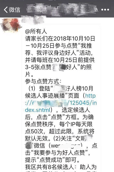 近日,廣東某所幼兒園的家長們又在群里收到老師發(fā)的通知:“請家長們在2018年10月10日-10月25日參與點贊‘我推薦、我評議身邊好人’活動,并請每班在10月25日前提供3-5張點贊的照片?!?/p>