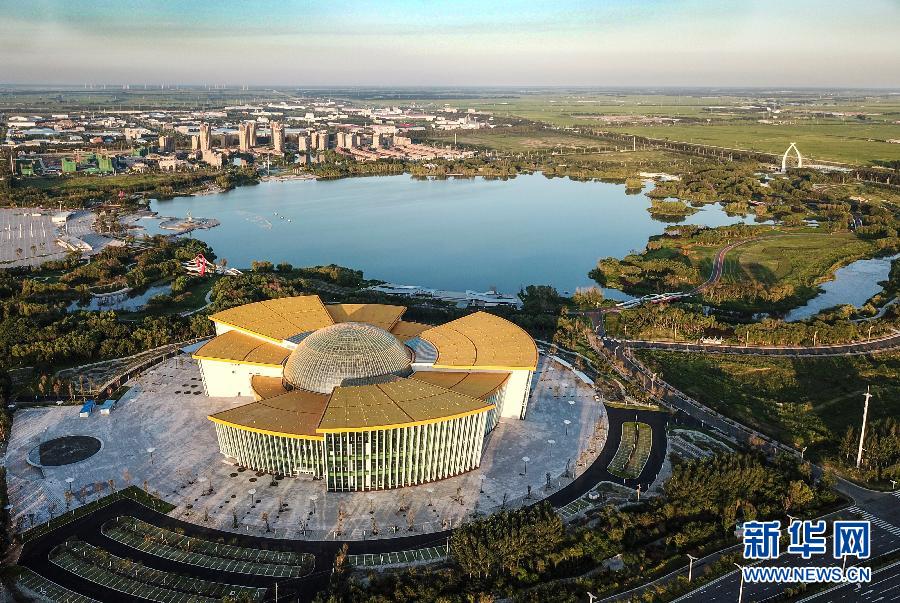 這是白城市科文中心及鶴鳴湖公園全景(7月28日無人機拍攝)。 新華社記者許暢攝
