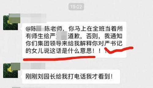 隨后,群內(nèi)署名為“嚴(yán)某某媽媽”的人士發(fā)言稱,“陳老師,你馬上在全班當(dāng)著所有師生給嚴(yán)某某道歉,否則,我通知你們集團(tuán)領(lǐng)導(dǎo)來給我解釋你對嚴(yán)書記的女兒說這話是什么意思!”后又稱學(xué)校已將該老師開除。