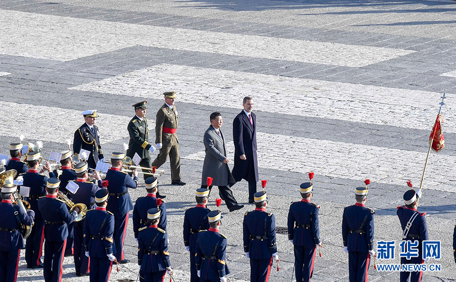 習(xí)近平和夫人彭麗媛乘皇家禮車在身著禮服、騎著高頭大馬的西班牙皇家衛(wèi)隊騎兵護(hù)衛(wèi)下,前往武器廣場。抵達(dá)時,鼓樂齊鳴,費(fèi)利佩六世國王和萊蒂西婭王后上前迎接,互致問候。費(fèi)利佩六世向習(xí)近平介紹王室高級官員。隨后,兩國元首夫婦一同登上檢閱臺。在21響禮炮聲中,軍樂團(tuán)奏中國、西班牙兩國國歌。儀仗隊長趨前請習(xí)近平檢閱。習(xí)近平在費(fèi)利佩六世國王陪同下依次檢閱步兵方隊、騎兵方隊和摩托車隊。習(xí)近平同西方陪同人員握手,費(fèi)利佩六世國王同中方陪同人員握手。兩國元首夫婦返回檢閱臺,觀看分列式。在摩托車隊引領(lǐng)下,整齊的軍樂隊、雄赳赳的步兵方隊、威武的騎兵方隊依次通過檢閱臺。