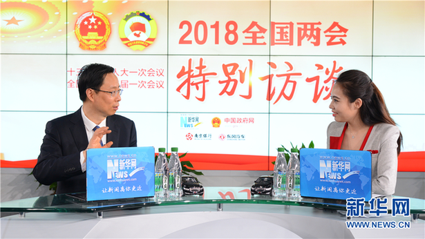 3月14日,全國人大代表、南京市市長藍紹敏(左)做客新華網2018全國兩會特別訪談。新華網 楊濛攝