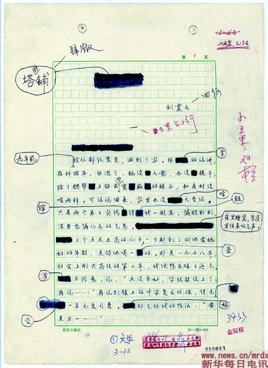 陳列于中國現(xiàn)代文學館的劉震云成名作《塔鋪》的手稿。