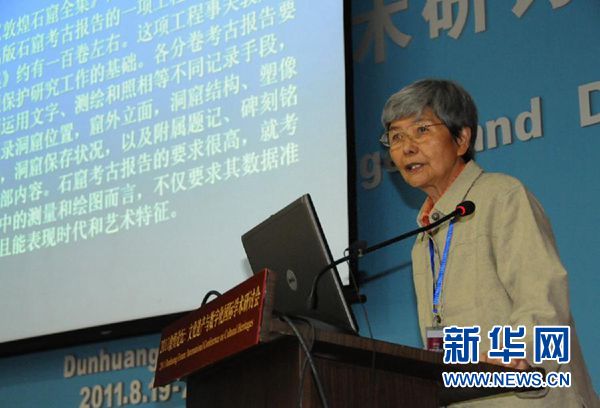 2011年8月19日,在敦煌莫高窟舉行的文化遺產(chǎn)與數(shù)字化國際學(xué)術(shù)研討會(huì)上,敦煌研究院院長樊錦詩在作報(bào)告。? 新華社發(fā)