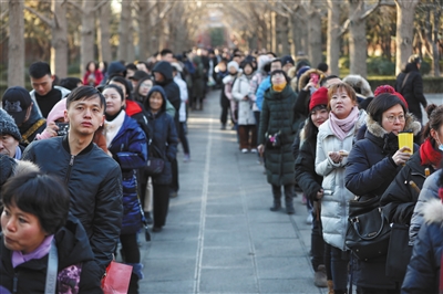 1月13日,雍和宮內(nèi)百米甬道,市民排隊(duì)等待領(lǐng)取臘八粥。
