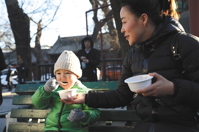代女士已經(jīng)連續(xù)13年來雍和宮喝臘八粥了。她說,自己懷孕時(shí)偶然趕上雍和宮舍粥,因?yàn)樽约菏歉啐g產(chǎn)婦,許愿“母子平安”。隨后每年臘八她都帶上家人來喝上一碗粥,今年恰逢周末,她就帶上兒子一起來,“參與這個(gè)節(jié)日已經(jīng)成了我們家的傳統(tǒng),每年來這里祈福納祥?!保ㄓ浾?張彤 攝影/記者 王飛)