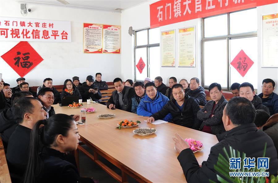 在臨沭縣大官莊村村民茶話會(huì)現(xiàn)場,歸鄉(xiāng)人員和村干部共同探討未來致富發(fā)展思路(2月7日攝)。新華社記者 袁軍寶 攝